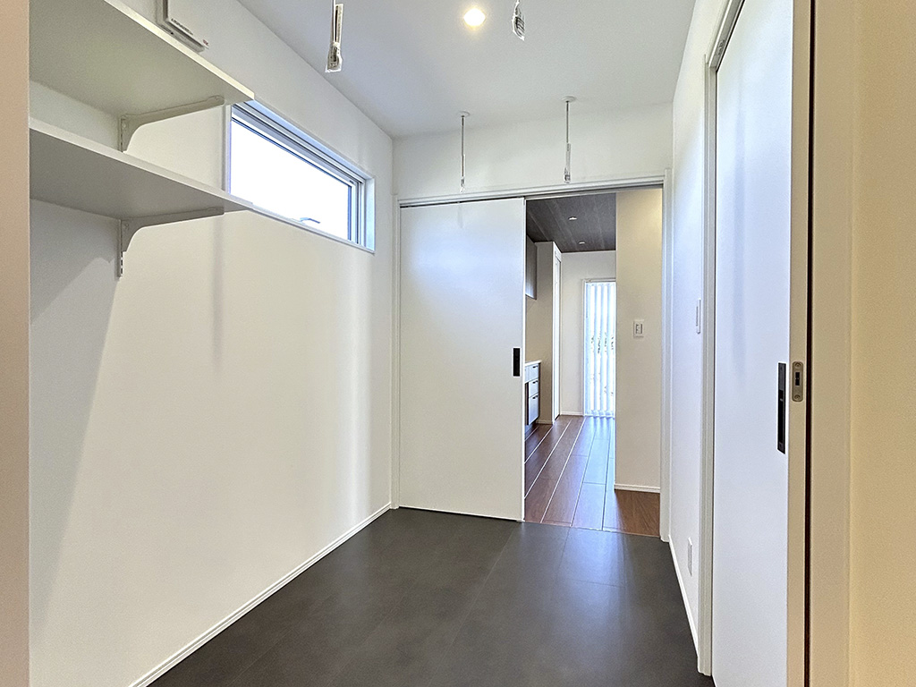 キッチン・脱衣室・ファミクロをつなぐスムーズな家事動線。脱衣室+洗面室を分けた間取りで来客時も安心。生活感を上手に隠せる設計。