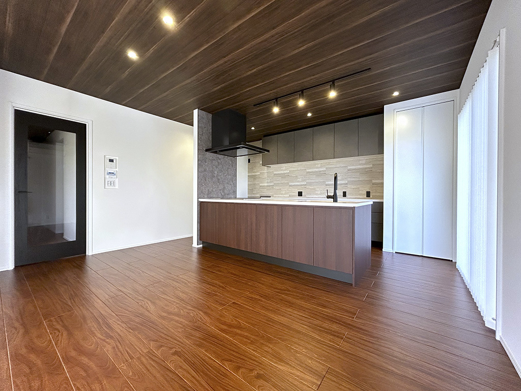 深みのあるマホガニー柄のフローリングとダークトーンの天井が、
