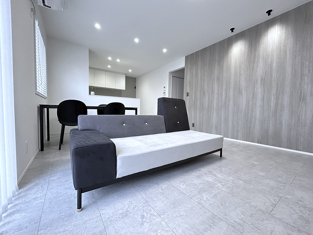LDK全体にはコテ塗りの風合いを表現したクレイ柄フローリングを採用し、木目とは一味違う落ち着いた上質感を演出。