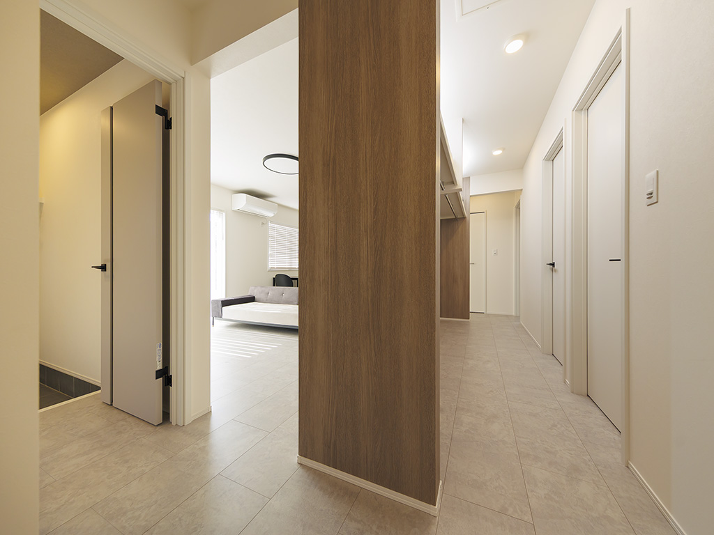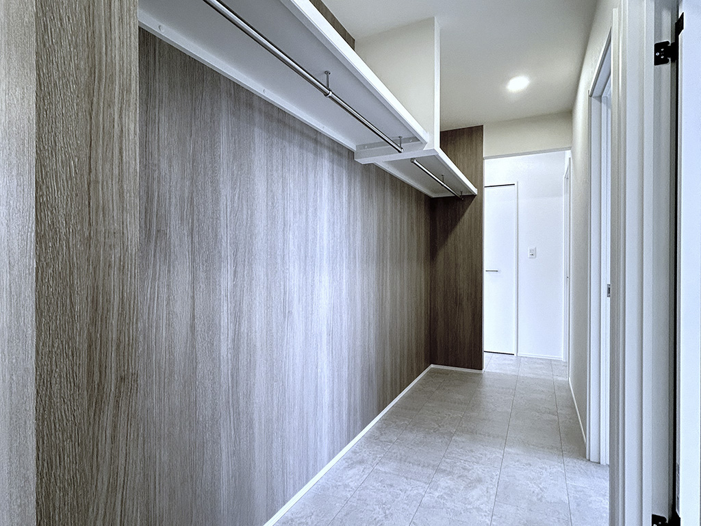 通り抜けできる設計で家族の衣類をまとめて収納し、生活感をスマートに隠す工夫。