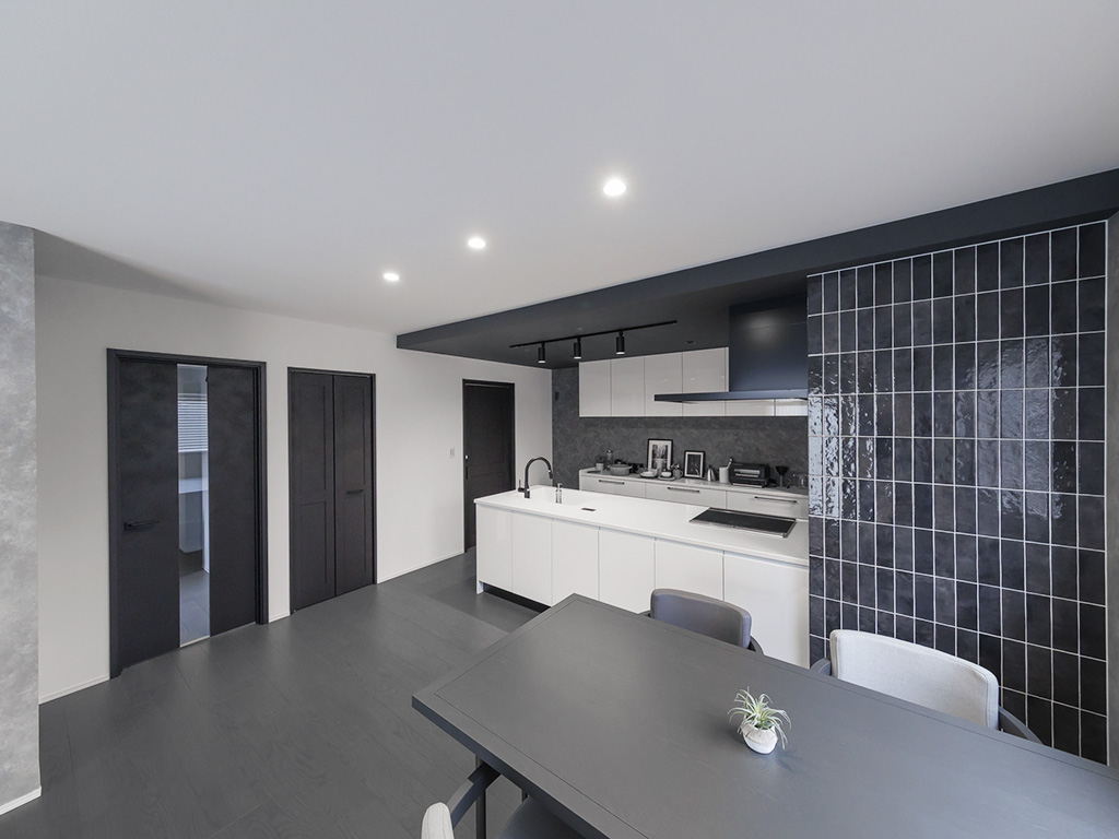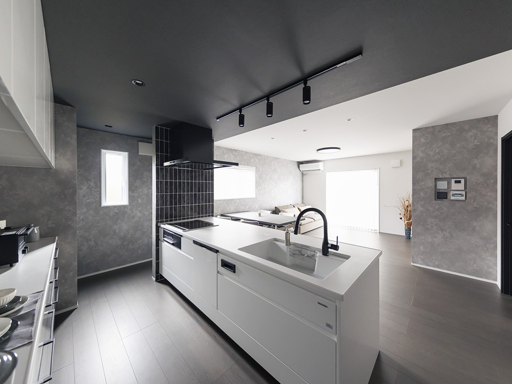 青みがかったミストグレーのフローリングが映える、シックなモノトーンの空間。高断熱窓+太陽光発電で光熱費も賢く抑えられ、スーパーまで徒歩5分の好立地。 かっこよさと暮らしやすさを両立した、こだわりの一邸です。