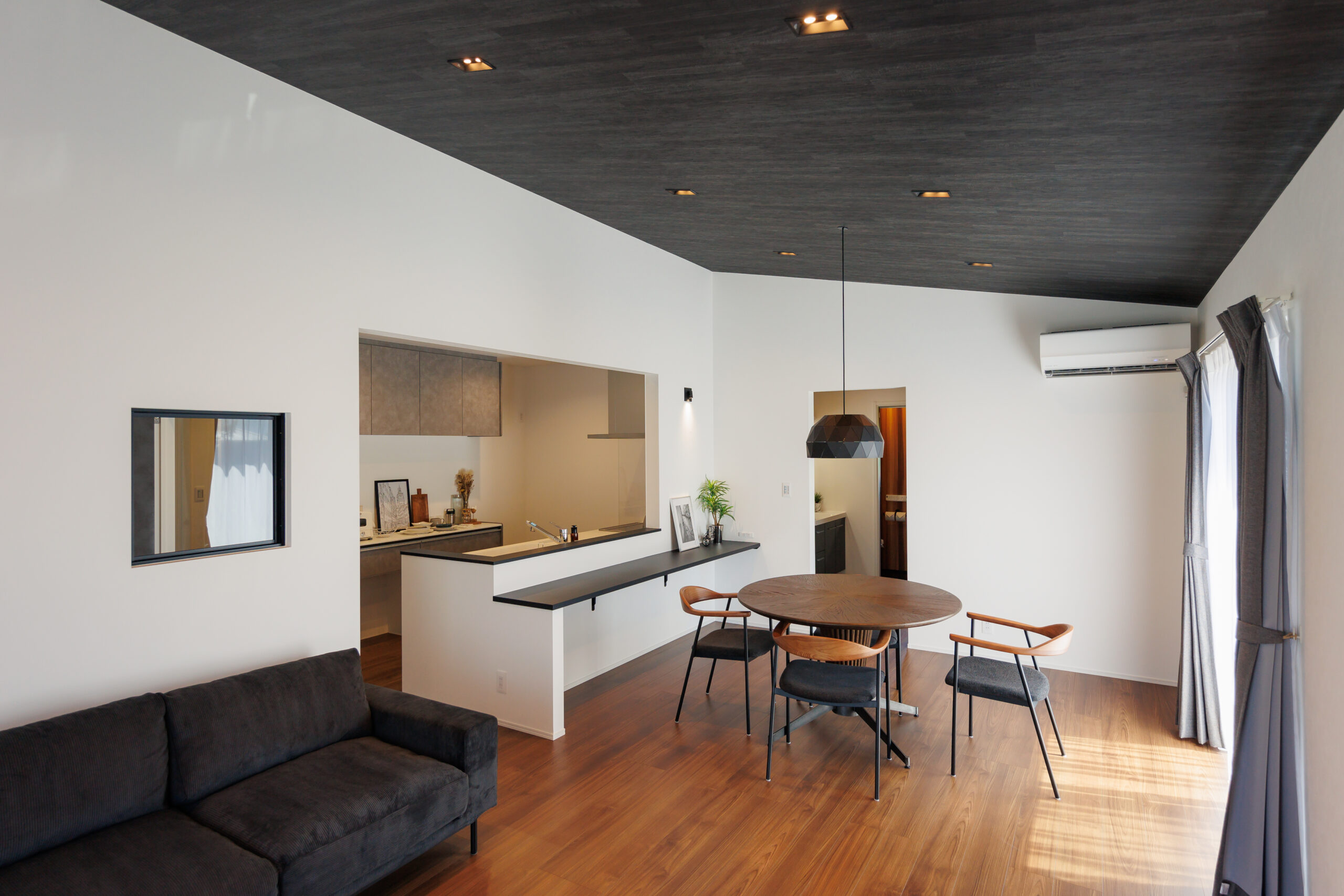 勾配天井や大きな窓、ウッドデッキなどで外との一体感を演出。リビングから庭まで視線が抜け、実際の広さ以上の開放感を感じられます。